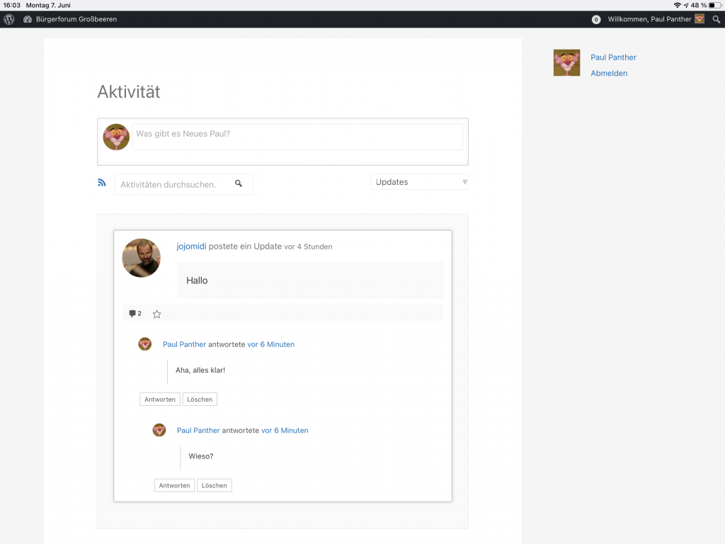 Über ‚Aktivität‘ kann man sich ansehen, welche Beiträge zuletzt veröffentlicht wurden.